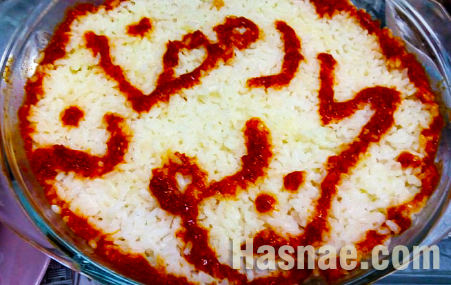 - نقطع الخبز قطعا صغيرة و نضعه مباشرة في طبق التقديم. نضع عليه بضع ملاعق من صلصة الطماطم، و شوربة اللحم ثم نخلط جيدا. نرص فوقه الأرز، ثم نزينه من فوق بصلصة الطماطم.