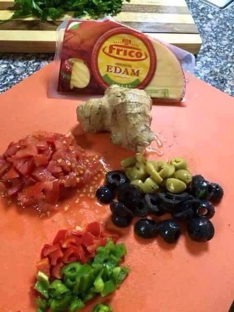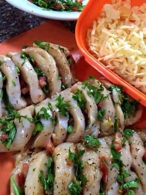 – نحضر الحشوة المتكونة من فلفل أخضر و أحمر, زيتون أخضر و أسود, بقدونس, طماطمو زنجبيل و نحشي شقوق الصدور بها