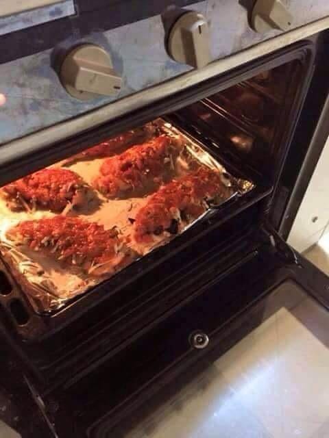 – نضع الجبنة فوق الدجاج ثم فوقها صلصة الطماطم